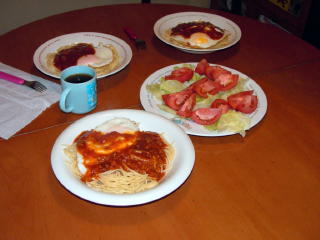 ミートスパ+目玉のせ&トマトサラダ